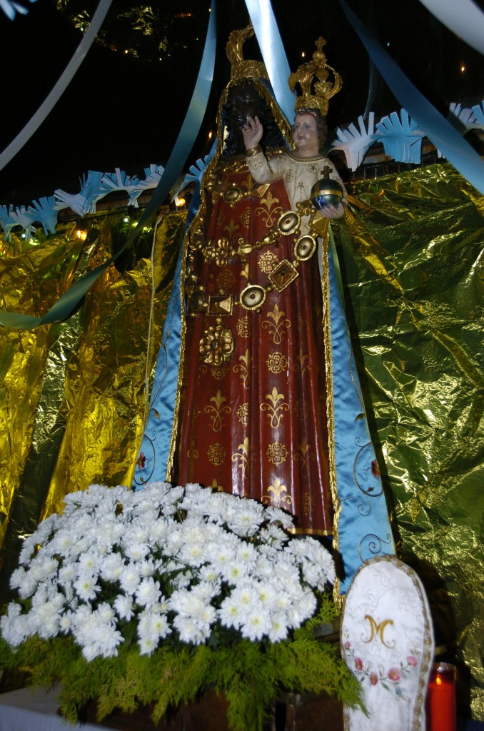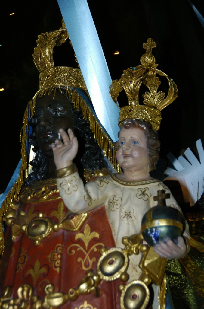 Caratteristica della statua è Madonna Nera con bambino bianco, che vuol rappresentare l’unità delle razze in Cristo ed in Maria. Dal collo della Vergine pende una collana di tre file di preziosi, riprodotti in modo grossolano, da cui la credenza delle donne di Fiumelatte ha voluto ricavarne la segreta ricetta dei tortelli; infatti questa è anche chiamata “Madonna di turtej”.