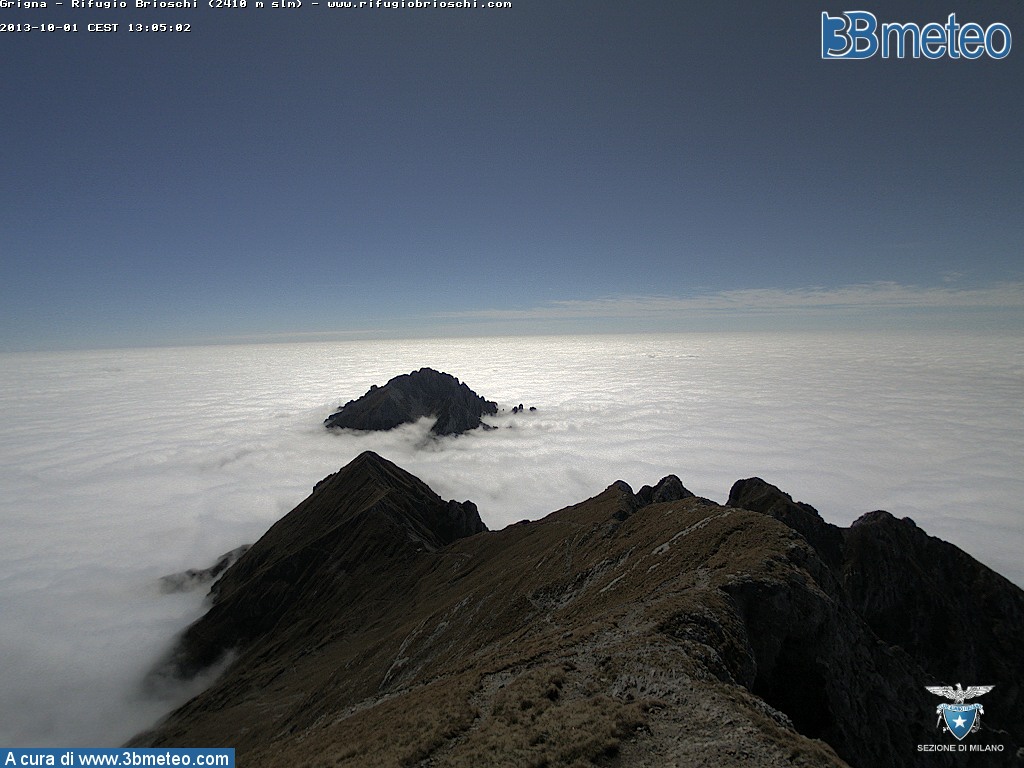 LECCO – Un’immagine vale più di mille parole. Quella che vedete è stata scattata alle 13 di oggi in cima al Grignone dalla Web Cam installata da 3BMeteo al rifugio Brioschi (2410m). Uno scatto che mostra qual’è l’effettiva situazione meteo che sta caratterizzando la giornata di oggi, martedì 1 ottobre. Un mare di nuvole e sopra i 2mila metri splende il sole e il cielo è sempre più blu! (foto tratta da http://www.3bmeteo.com/le_webcam/rifugio_brioschi)