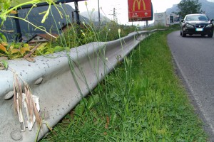 LECCO – Basso, praticamente rasoterra, con diverse storture e a tratti ricoperto dalla vegetazione: un guardrail non certo in grado di garantire la sicurezza, quello posizionato sulla SS639 nel rione di Chiuso, a pochi passi da Vercurago, posto a presidiare la scarpata di una decina di metri che separa la Statale dai binari della ferrovia.