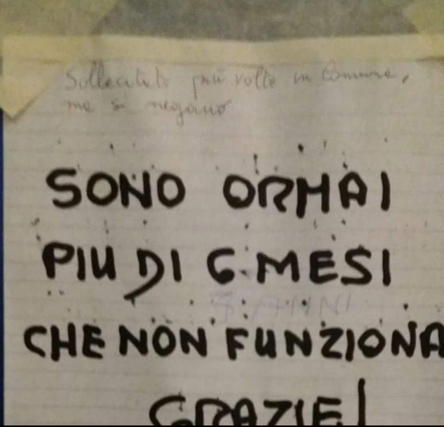 La notizia è emersa in seguito alla segnalazione del consigliere Andrea Frigerio che aveva fatto notare il malfunzionamento dell’ascensore del cimitero di Castello e quel cartello appeso da un utente che denunciava il malfunzionamento (“da sei mesi non funziona”) riempito poi di scritte ingiuriose contro sindaco e giunta, come riferito dal consigliere del PD che ha provveduto a rimuoverlo.
