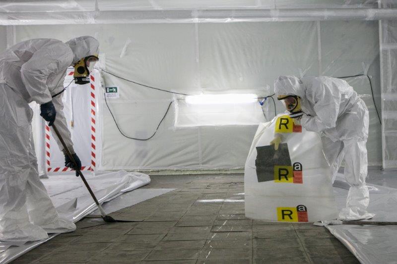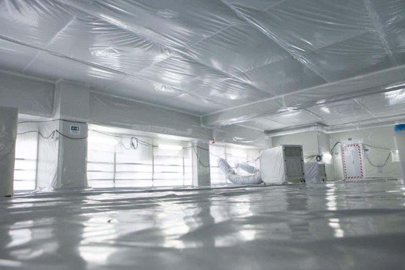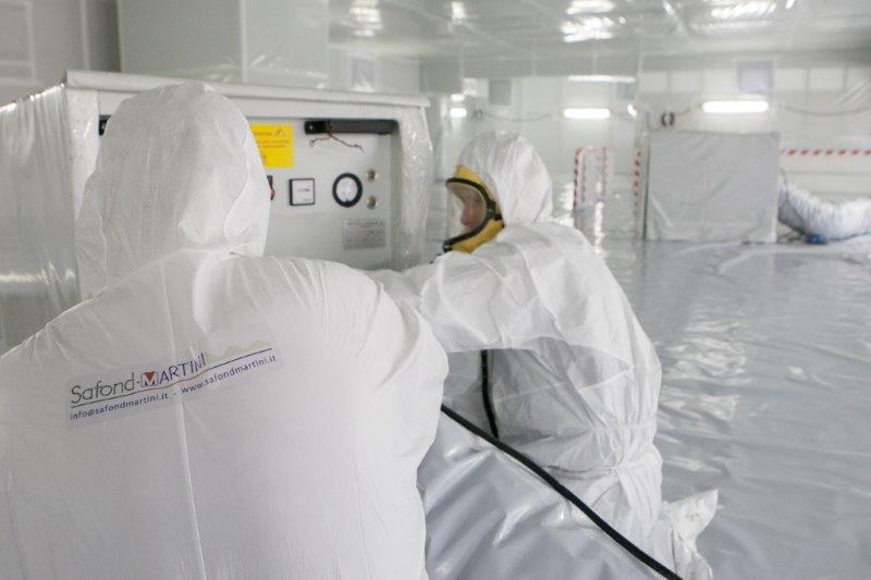 Come imposto dalla normativa vigente in materia di dismissione dei materiali contenenti amianto, e sicurezza e salute sui luoghi di lavoro, particolare attenzione e accuratezza sono state poste nell’allestimento di sei aree confinate, sia staticamente mediante la sigillatura dei volumi con strati di polietilene, sia dinamicamente mediante l’installazione di estrattori d’aria atti a mantenere i volumi confinati in costante depressione rispetto agli ambienti esterni, all’interno delle quali è prevista la bonifica dell’amianto in matrice friabile.