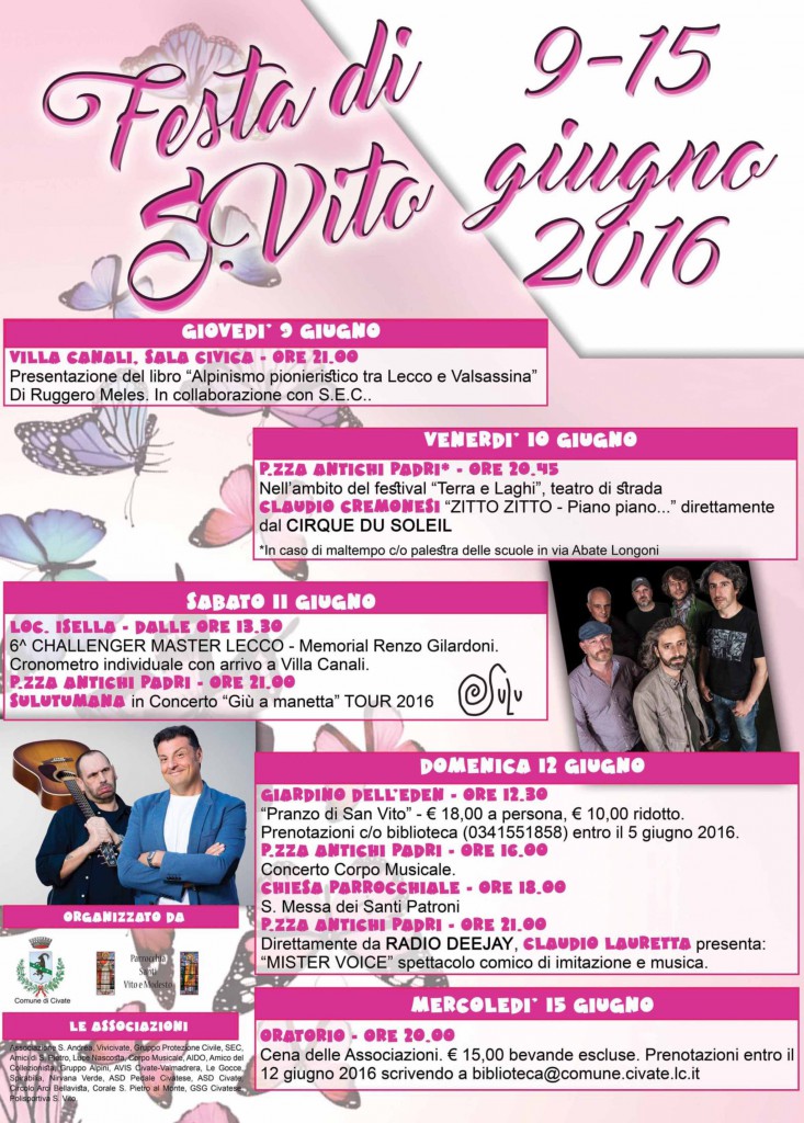 – domenica 12 giugno: ore 12.30, presso il giardino dell’Eden, Pranzo Di San Vito. Menù completo € 18,00 a persona; menù ridotto € 10,00 a persona Per info e prenotazioni rivolgersi presso la biblioteca di Civate (0341-551858) entro e non oltre domenica 5 giugno.