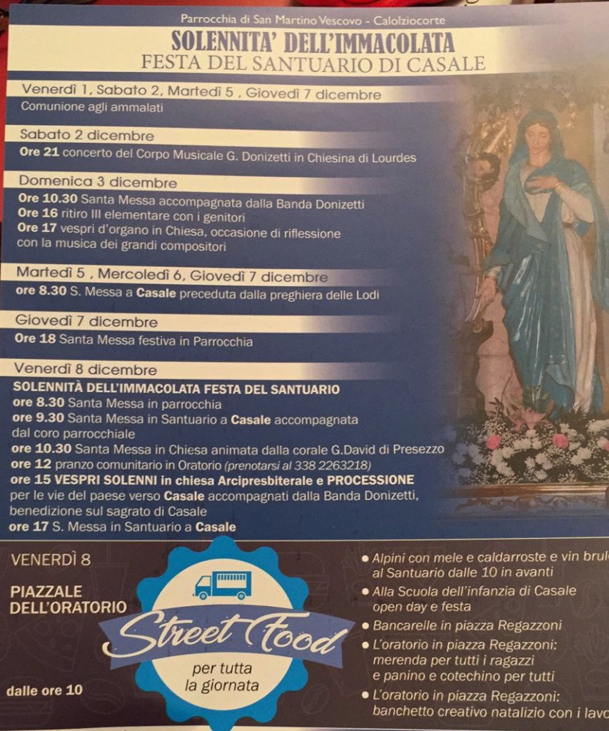 Sempre l’8 dicembre sarà possibile pranzare tutti insieme all’oratorio (prenotazioni al 338 2263218), mentre sabato 2 dicembre alle 21 è in programma il concerto del Corpo Musicale Donizetti nella chiesetta di Lourdes.