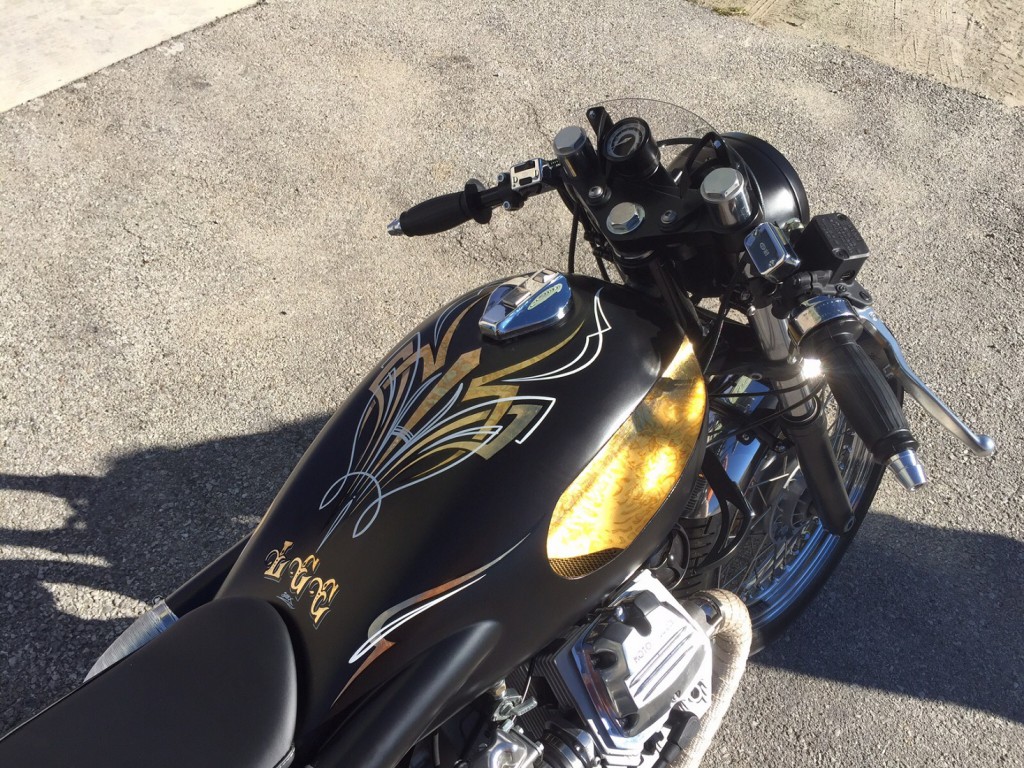 Queste le caratteristiche della moto personalizzata dalla L.G.C.: serbatoio in acciaio realizzato a mano con prese di aspirazione dirette, due carburatori diametro 40 tipo racing, pedane, comandi, porta targa monobraccio e supporto indicatori anteriori creati in esclusiva da L.G.C. e faro anteriore full led.
