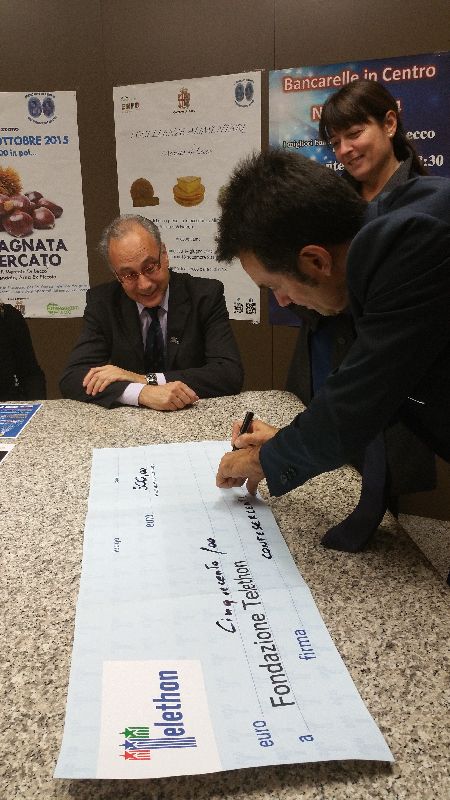 LECCO – Un assegno di 500 euro consegnato martedì da Confersercenti a Telethon, offerto dagli operatori del mercato di Lecco.
