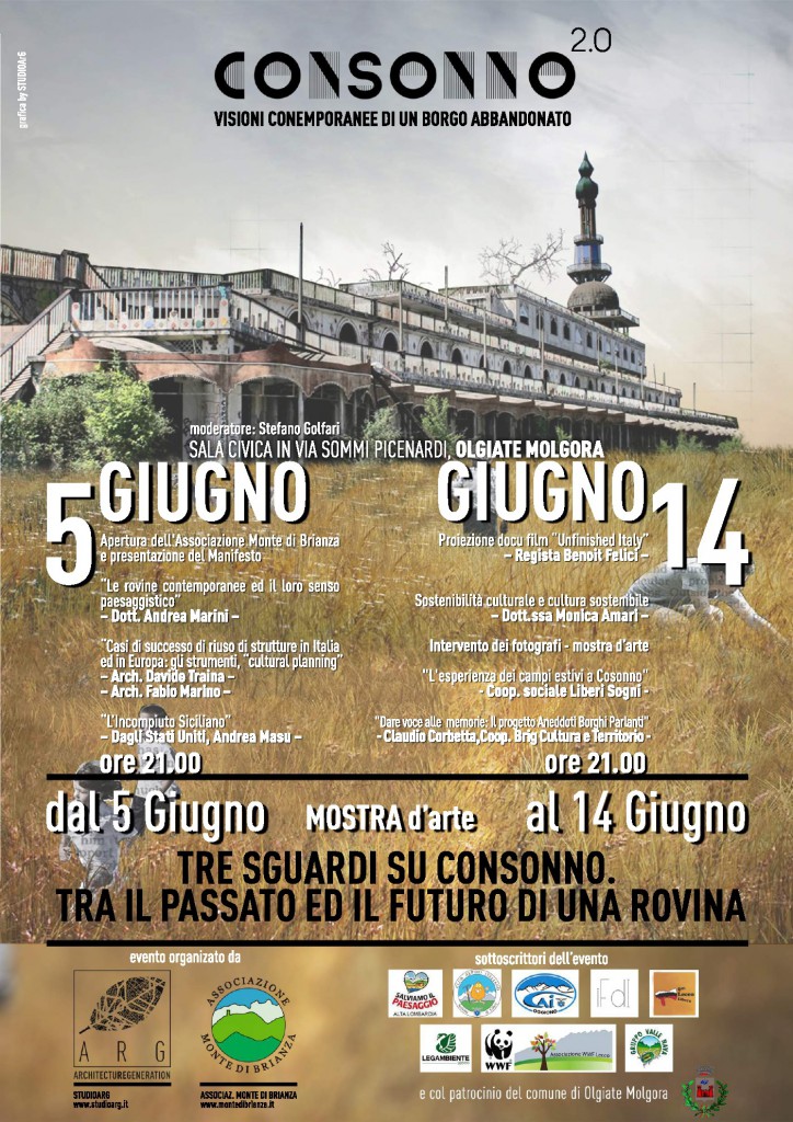 • 14 giugno, conferenza di chiusura: Professoressa Monica Amari, esperta di politica e progettazione culturale del territorio con docenze al Politecnico di Milano, all’Università degli Studi Milano-Bicocca e Università Cattolica di Milano, promotrice del Manifesto per la Sostenibilità Culturale. Claudio Corbetta, coop. BRIG Cultura e Territorio, con il progetto “Dare voce alle memorie: Il progetto Aneddoti Borghi Parlanti” e con la proiezione di video-interviste di ex-abitanti di Consonno, cortesia dell’ Associazione Amici di Consonno. Coop. Liberi Sogni, con l’ “esperienza dei campi estivi a Consonno” che ha portato molti giovani ragazzi a contatto con le “rovine”. La proiezione del docu-film ITALIAN UNFINISCHED realizzato sull’esperienza dell’Incompiuto Siciliano.