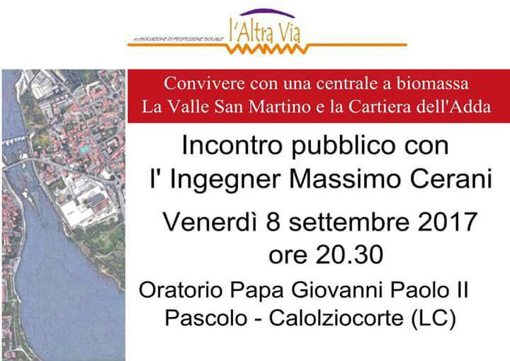La serata è organizzata dall’Associazione L’Altra Via e sarà dedicata appunto alla centrale a biomassa posta all’interno della Cartiera dell’Adda: “Durante l’incontro avremo modo di rispondere ad alcune domande grazie alla presenza dell’esperto Massimo Cerani – spiegano gli organizzatori – quali cos’è una centrale biomassa? Bruciare per produrre energia è utile? Chi ci guadagna? Cosa si può fare per far convivere la centrale a biomassa con i diritti dei cittadini a vivere in un ambiente salubre?”.