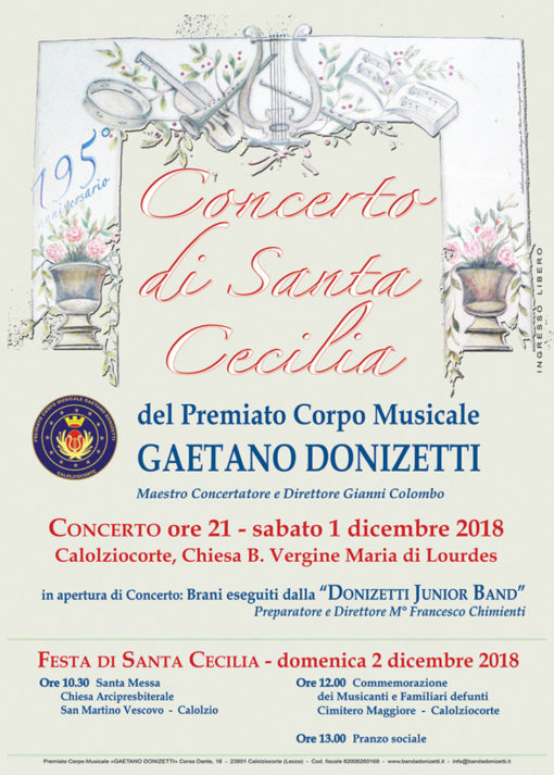 CALOLZIOCORTE – Il Premiato Corpo Musicale Gaetano Donizetti in occasione della ricorrenza della Festa di Santa Cecilia, Patrona della Musica e dei Musicisti, celebra l’annuale festa sociale offrendo il tradizionale Concerto ospitato nella chiesa della Beata Vergine Maria di Lourdes a Calolziocorte in programma sabato 1 dicembre 2018, alle ore 21.