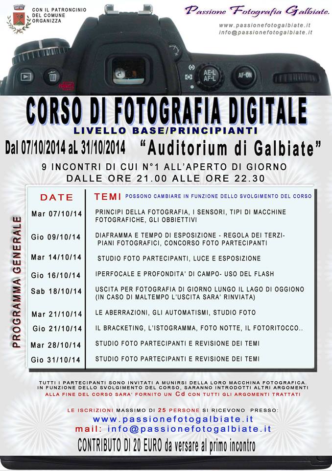 GALBIATE – Aspiranti fotografi, segnatevi i contatti ed affrettatevi alle iscrizioni. Il gruppo “Passione Fotografia Galbiate” con il patrocinio dell’omologo Comune, organizza dal 07/10/14 al 31/10/14 presso l’Auditorium, un corso base di fotografia digitale aperto a tutti livello base/principianti (vedere volantino di seguito ed il sito dell’associazione http://www.passionefotogalbiate.it/).