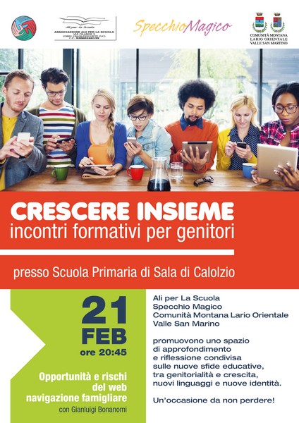 “Crescere insieme”, questo il titolo dell’iniziativa, è in programma presso la scuola primaria di Sala mercoledì 21 febbraio alle 20.45. Insieme a Gianluigi Bonanomi si parlerà di “Opportunità e rischi del web navigazione famigliare”.