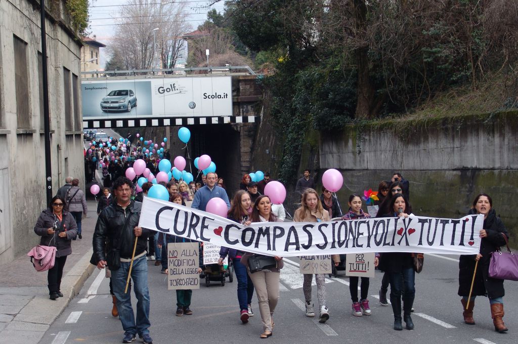 LECCO – Tanta emozione e altrettanta voglia di unirsi per gridare a gran voce: “Curarsi è un diritto di tutti”. E’ partito dalla piazzetta del centro Meridiana il corteo che, sabato pomeriggio, ha inondato il centro storico del capoluogo di palloncini rosa e blu, per chiedere il libero accesso alle cure compassionevoli.