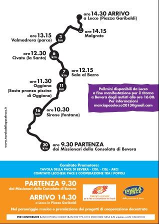 Ecco il programma del percorso della 6^ edizione della marcia della pace organizzata dal Comitato Lecchese per la Pace e la Cooperazione tra i Popoli e dalla Tavola della Pace della Provincia di Lecco: