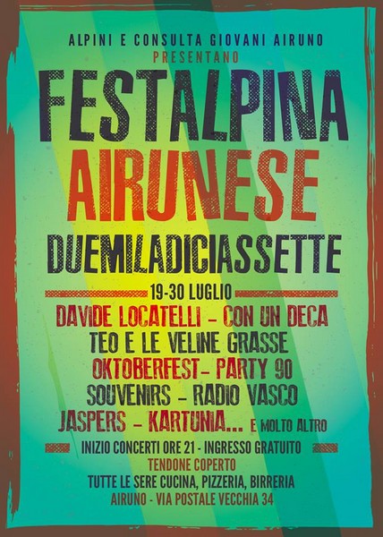 Per la settima stagione infatti, le penne nere ed i ragazzi della consulta presentano una festa caratterizzata da una giovane varietà musicale a fianco dell’ eccezionale tradizione culinaria alpina, a condire questo particolare menù, come gli scorsi anni, i tornei serali di calcio a 7 femminile e maschile in collaborazione con l’Unione Sportiva.