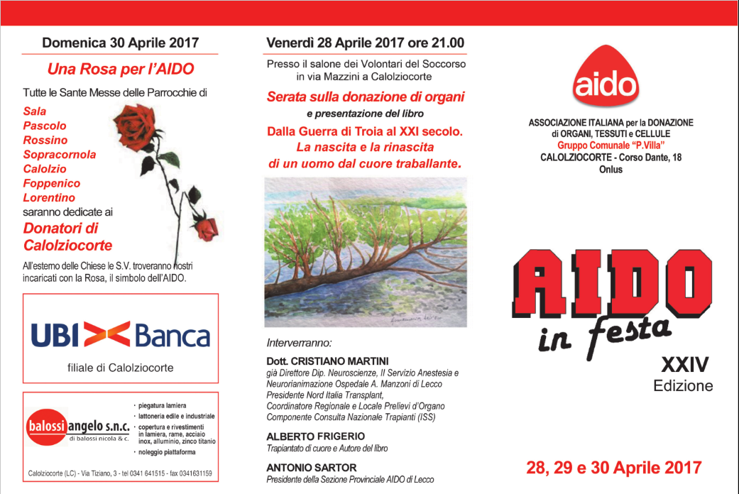 CALOLZIO – È in programma per i prossimi 28, 29 e 30 aprile “AIDO in festa” la kermesse, giunta alla sua 24esima edizione, organizzata dalla sezione calolziese dell’Associazione Italiana per la Donazione di Organi.