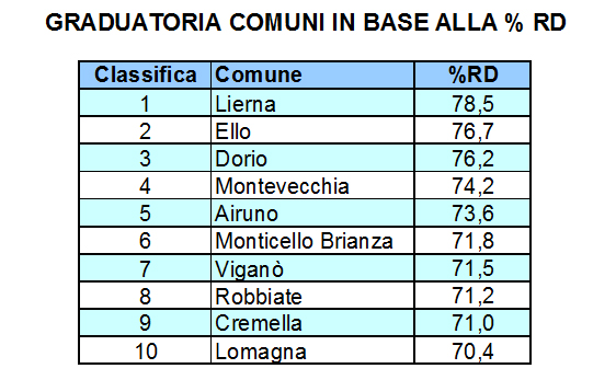 Fanno bene anche Comuni come Cremella con il 71% (dal 16° al 9°posto ), Pescate con il 68,8% (dal 26° al 15° posto), Bellano con il 67,2% (passato da 38° al 22° posto) e Abbadia Lariana con il 63,4% (dal 52° al 42°).