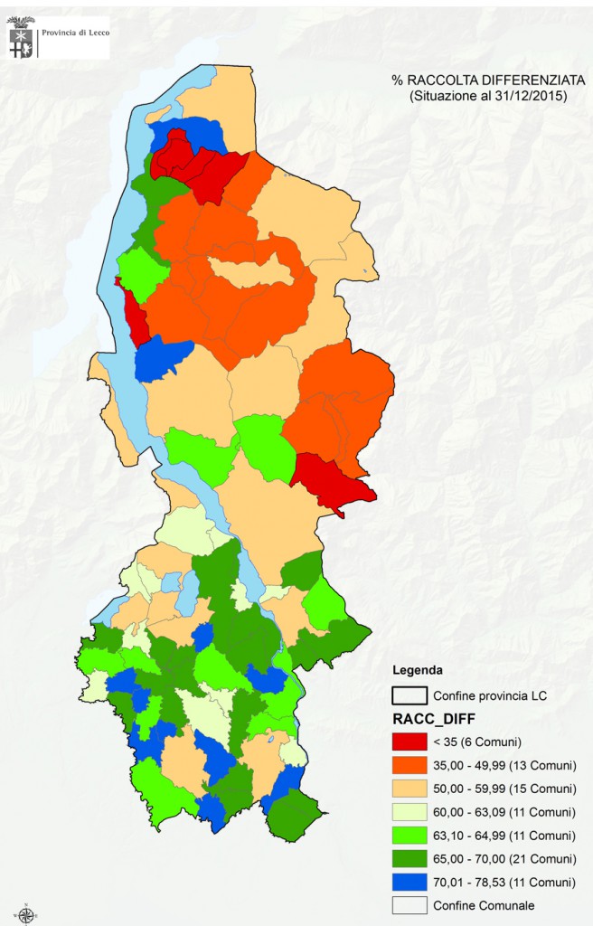 Lecco è solo in 60esima posizione rispetto agli altri Comuni della provincia, ma è riuscito ad incrementare la differenziata passando dal 56% del 2014 al 58,2% dello scorso anno.