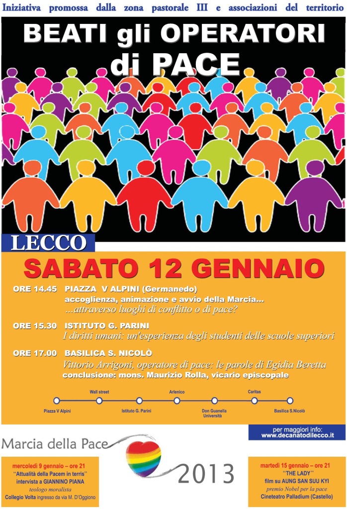 Il percorso vedrà i partecipanti muoversi alla volta dell’ex Wall Street, per raggiungere poi l’Istituto Parini dove si svolgerà una sosta: dove si affronterà il tema: “I diritti umani: un’esperienza degli studenti delle scuole superiorie”; quindi la marcia riprenderà in direzione Arlenico, Don Guanella, Caritas per raggiungere infine, verso le 17, la Basilica di San Nicolò con l’intevento di Egidia Beretta, mamma di Vittorio Arrigoni, operatore di pace uccisio nel 2011 a Gaza e la conclusione di monsignor Maurizio Rolla, vicario episcopale.