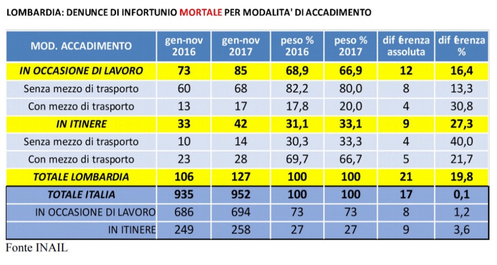 In Lombardia, da gennaio a novembre 2017, sono stati 127 i morti sul lavoro.