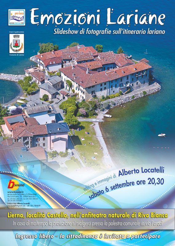 Sabato 6 Settembre invece alle ore 20.30 a Riva Bianca di Lierna (in caso di pioggia presso la palestra comunale) “Emozioni Lariane”, slideshow di fotografie sull’itinerario lariano.