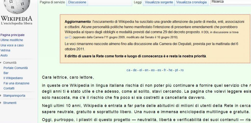 Che succede, in pratica? Il sito, frequentato quotidianamente da milioni di navigatori italiani, si è “auto-oscurato”: impossibile accedere alle tantissime voci nella nostra lingua, disponibile solo un messaggio che spiega la situazione e le prospettive anche di Wikipedia se la proposta di riforma, che il Parlamento sta discutendo in questi giorni, verrà approvata comprendendo anche il famoso obbligo per tutti i siti web di pubblicare, entro 48 ore dalla richiesta e senza alcun commento, una rettifica su qualsiasi contenuto che il richiedente giudichi lesivo della propria immagine.