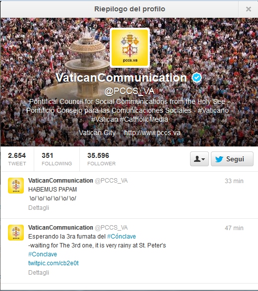 Ore 19.06, campane a festa anche a Lecco. Eletto il nuovo Papa al quinto scrutinio. Grande festa in piazza San Pietro a Roma strabordante di fedeli. Si attende il nome del nuovo Pontefice successore di Benedetto XVI.