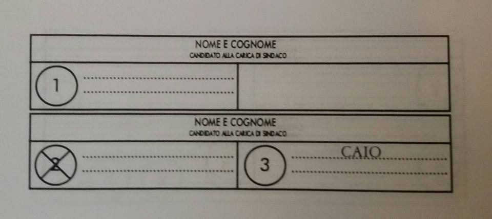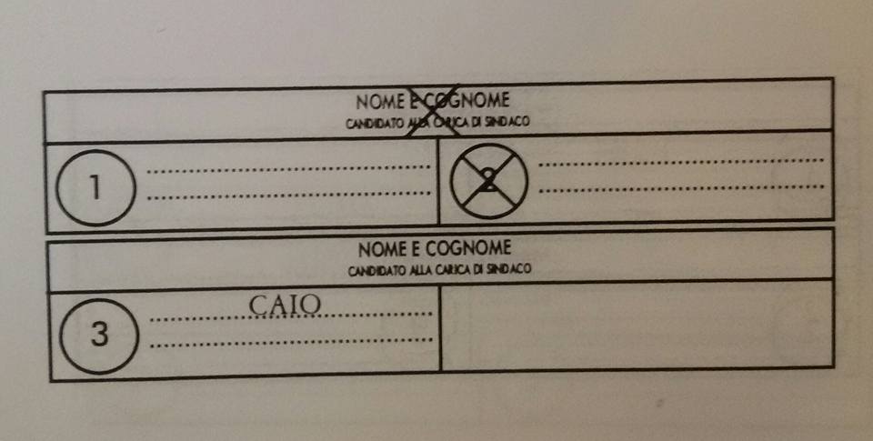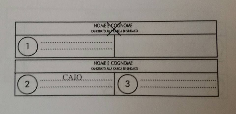 – se viene apposta una croce sul nome di un candidato sindaco e viene scritto il nome di un candidato consigliere che non fa parte della lista collegata al candidato sindaco scelto: il voto va al candidato sindaco indicato, al consigliere comunale di cui si è scritto il nome e alla lista di cui il candidato consigliere fa parte