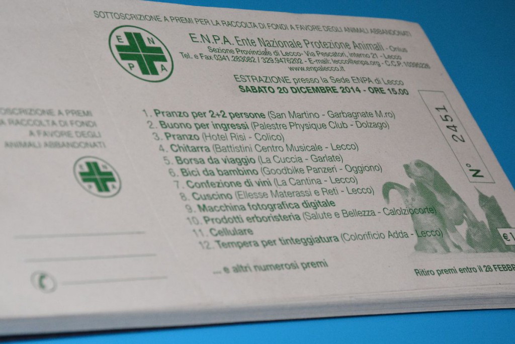 Il costo del biglietto è di 1 euro e potete acquistarlo attraverso i volontari, ai banchetti dell’associazione, oppure passando alla sede dell’associazione ogni martedì sera in Via Plava a Lecco. L’estrazione si terrà il 20 dicembre alle ore 15, presso la sede dell’Enpa di Lecco.