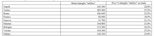 Il capoluogo di provincia lombardo dove le famiglie risultano meno infelici è Monza (solo il 22,3% dei nuclei familiari) Milano è a quota 23,8% di “infelic”i. Lo studio realizzato con il coordinamento scientifico di Ref-Ricerche per l’economia e la finanza e in collaborazione con DigiCamere, e su dati Istat e Ministero dell’Economia e delle Finanze ha evidenziato che in Italia a Firenze c’è la concentrazione delle famiglie più felici (91,1%), seguita da Genova e Palermo.