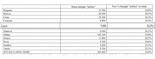 Un dato preoccupante. Sono ben cinquemila le famiglie lecchesi che sentono il disagio economico dovuto alla crisi, vivono male e si sentono infelici. Si tratta di quasi un quarto di quelle residenti in città (il 23,4%). Una dimensione enorme che – mal comune non sempre è mezzo gaudio – non differisce dalla media della maggior parte degli altri capoluoghi lombardi (si veda la tabella sotto).