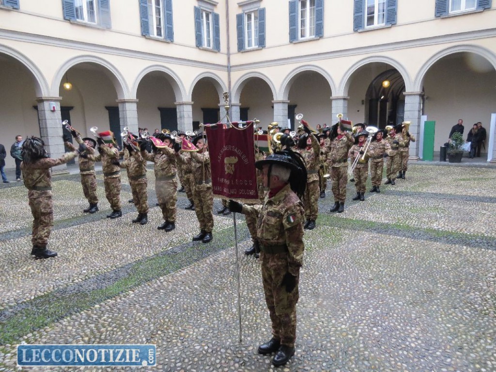 LECCO – Anche quest’anno la Fanfara dei Bersaglieri ha fatto capolino nel cortile del Comune di Lecco per il tradizionale saluto natalizio. Ad accoglierli l’assessore Elisa Corti (Affari Istituzionali) e il presidente del consiglio comunale Alfredo Marelli. Presenti anche i consiglieri  Irene Riva (PD) e Giovanni Colombo (Lega).