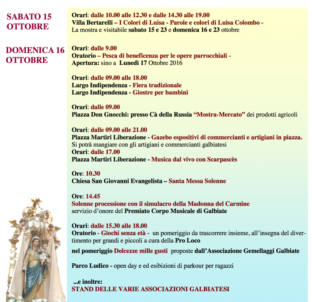 Domenica la pesca di beneficienza a partire dalle ore 9 e a seguire tante iniziative tra cui la mostra-mercato dei prodotti agricoli, i gazebo con i prodotti dei commercianti e degli artigiani galbiatesi e giochi per i più piccoli. Alle ore 10 la Santa Messa e alle 14.45 la solenne processione con il simulacro della Madonna del Carmine.