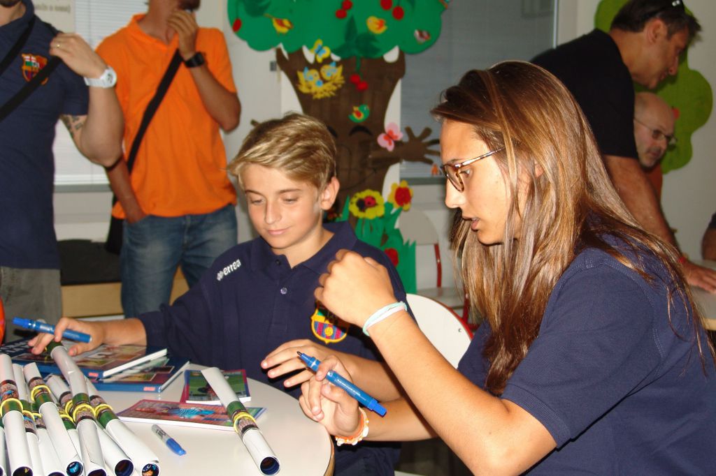 LECCO – Due giovanissimi giocatori del FC Barcelona, Maria Ripoll Ruiz (19 anni) e Pau Martinez Gil (13 anni), rispettivamente capitano della squadra femminile B e attaccante esordiente nonché miglior marcatore del 2013, venerdì hanno fatto visita ai piccoli ospiti della Pediatria del Manzoni portando loro gadget e stendardi della squadra.
