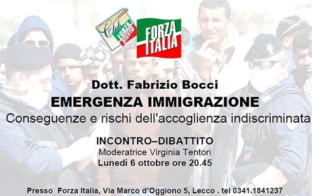 L’incontro, dal titolo “Emergenza immigrazione” sarà condotto dal Dott. Fabrizio Bocci, ex Questore di Lecco: “Ai presenti verrà proposto un percorso politico che parte dalla politica di “accoglienza indiscriminata”, riproposta ancora una volta dal governo di sinistra, che ha creato una vera e propria emergenza emigrazione con aumento esponenziale dei flussi migratori dall’Africa verso le coste siciliane ben lontano dall’ essere interrotto. La tanto esaltata operazione “Mare Nostrum”, messa in atto a seguito del luttuoso naufragio di Lampedusa, condotta dalle navi della nostra Marina, con costi giornalieri astronomici (300.000 euro) pari a più di nove milioni di euro al mese solo per la Marina, non ha fatto che favorire le organizzazioni criminali dedite al traffico di clandestini che hanno visto di gran lunga incrementati i loro illeciti profitti con contemporaneo abbattimento delle “spese di esercizio”.” Commento questo del club Forza Italia Lecco, che ha proseguito: “I Centri di accoglienza, anche nel resto del Paese, sono al collasso, esiste l’ Impossibilità per le FF.OO. di procedere all’identificazione ed al foto- segnalamento dei clandestini per la gran massa di arrivi; Sono in atto massicci trasferimenti degli immigrati nelle provincie del nord e centro Italia con gravissimi problemi ricettivi (sbandati per le strade, nelle stazioni e nei luoghi pubblici) e con inevitabile incremento dei reati.”