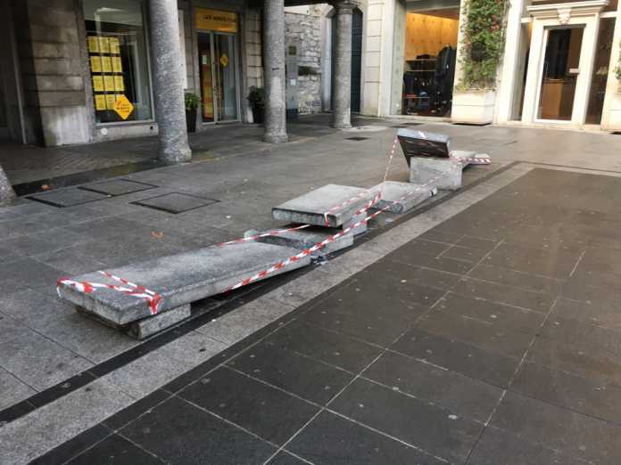 LECCO – “Crollata” a terra: così ai passanti in centro città si è presentata la panchina in marmo situata in Piazza XX Settembre, proprio sotto la Torre Viscontea.