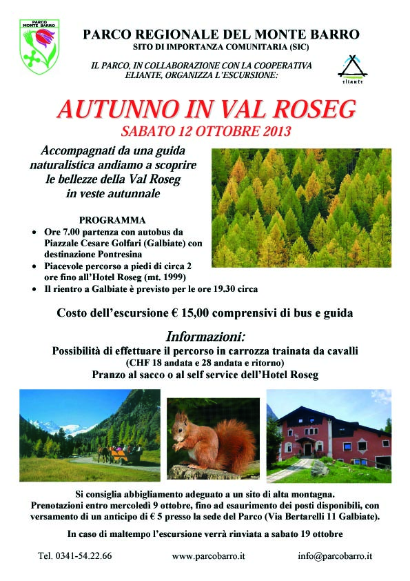 GALBIATE- Cancellata a causa del maltempo la gita in Val Roseg prevista per sabato 12 ottobre. L’escursione, organizzata da Parco Monte Barro in collaborazione con la cooperativa Eliante, non verrà rinviata come prestabilito al 19 ottobre a causa delle previsioni che confermano brutto tempo anche per il week end successivo. Gli iscritti potranno riavere la caparra versata recandosi alla sede in via Bertarelli n.11, a Galbiate.