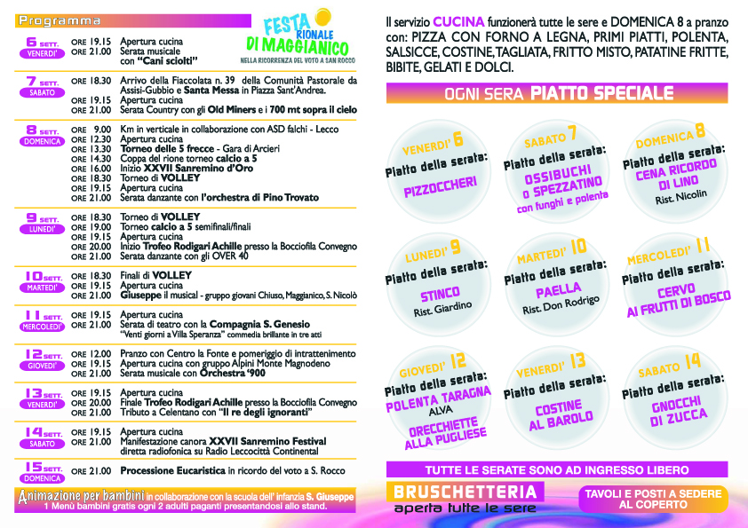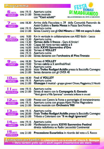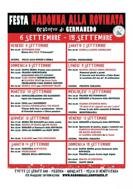 LECCO – Dal 6 al 15 Settembre partono le feste patronali: all’oratorio di Germanedo si parte con il September Fest e a seguire le diverse serate che alterneranno intrattenimento, sport e musica. Lo stesso a Maggianico, che apre la festa rionale con la band i Cani Sciolti.