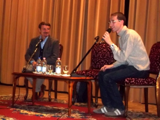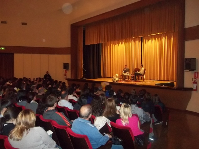 Intervistatore Giovanni Tagliaferri, stretto collaboratore di don Carlo Luoni, responsabile decanale lecchese della Pastorale giovanile, che ha fatto anche da ottima “spalla” all’attore comico. L’iniziativa, organizzata dalla Pastorale Giovanile del Decanato di Lecco denominata “Fuori dal Guscio“, ha come obiettivo promuovere alcune occasioni di dialogo e dibattito attorno a temi di grande interesse, con l’aiuto di testimoni autorevoli del nostro tempo. La prima manifestazione aveva visto la partecipazione di almeno 500 “tifosi” tra cui molti bambini e adulti con la testimonianza del calciatore della Juventus e della Nazionale Nicola Legrottaglie.