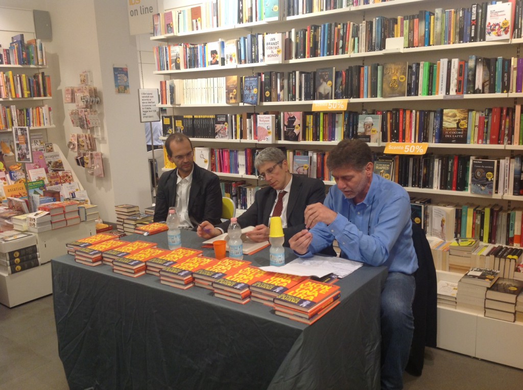 Mario Giordano a Lecco con Confcommercio Lecco - tavoloLECCO – “Essere contro l’euro non vuol dire essere populisti o demagoghi. Basta aprire gli occhi e smetterla di credere in modo cieco a un sistema che ci sta portando alla rovina”. Il direttore del Tg4 Mario Giordano non ha usato giri di parole durante la presentazione del suo libro “Non vale una lira. Euro, sprechi, follie: così l’Europa ci affama” avvenuta giovedì 24 luglio presso la libreria Ibs.it Bookshop di via Cavour all’interno della manifestazione Shopping di Sera, promossa da Confcommercio Lecco. A dialogare con Giordano è stato l’imprenditore Angelo Belgeri, membro di Giunta di Confcommercio Lecco.