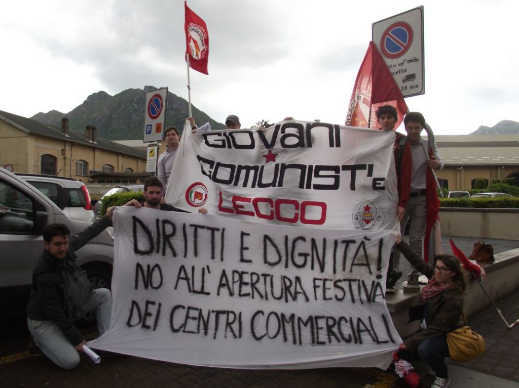 LECCO – Manifestare contro la legge che permette ai negozi di non rispettare il riposo nei giorni festivi: i Giovani Comunisti sostengono lo sciopero nazionale e presidiano con bandiere e striscioni all’esterno del centro commerciale “Meridiana”.