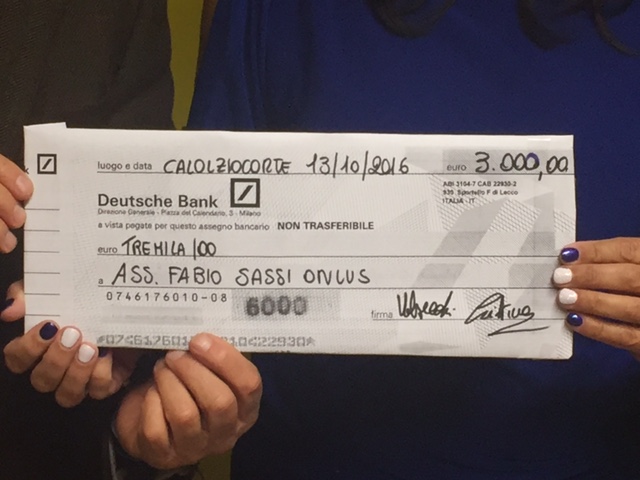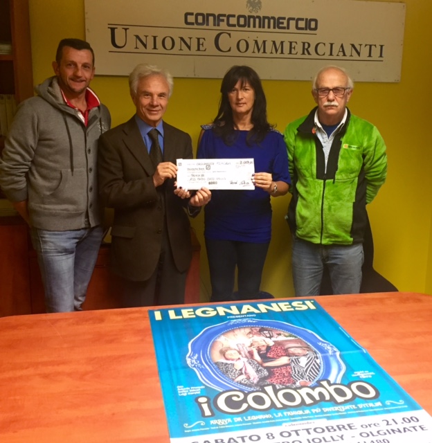 Ma il successo non è finito il giorno dello spettacolo. Infatti il ricavato della serata benefica è stato devoluto all’Associazione Fabio Sassi Onlus – Hospice Il Nespolo di Airuno. La consegna dell’assegno da 3000 euro sì è svolta giovedì 13 ottobre, nel pomeriggio, presso la sede della delegazione di Calolzio di Confcommercio Lecco. Il contributo è stato consegnato dal presidente di Confcommercio Lecco – Valle San Martino, Cristina Valsecchi, al presidente della Associazione Fabio Sassi Onlus, Albino Garavaglia. Nell’occasione sono intervenuti anche il presidente Pro Loco Olginate, Sergio Gilardi e il volontario dell’Associazione Fabio Sassi Onlus, Luca Ronchetti.