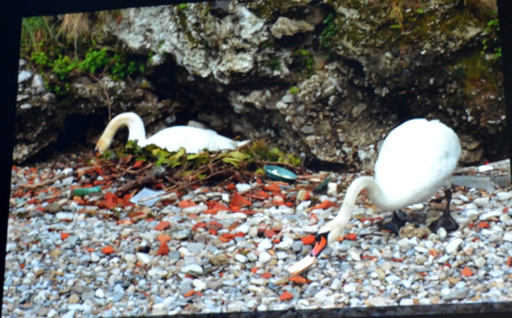 MANDELLO – Un cigno che nidifica su una riva di Mandello “circondato” dalla spazzatura, una famigliola di anatre più o meno nella stessa situazione.