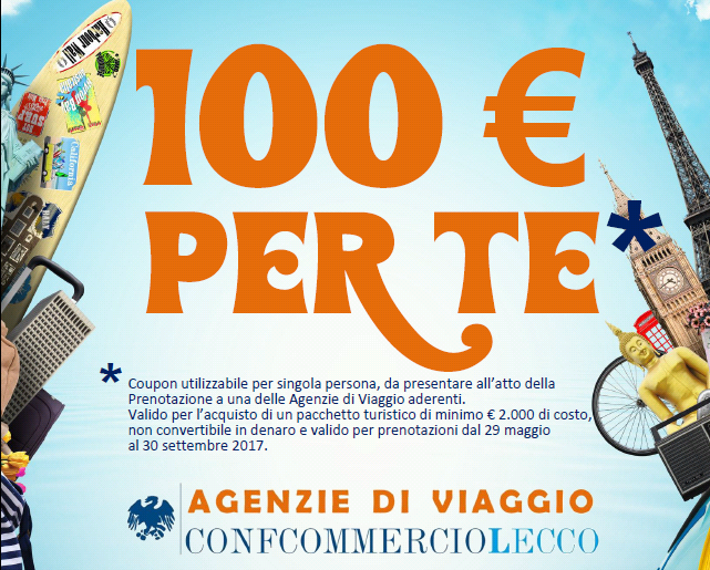 All’interno dell’Open Day sarà anche possibile ritirare un Coupon del valore di 100 euro che potrà essere utilizzato, entro il 30 settembre, in una delle Agenzie di Viaggio aderenti all’iniziativa: Rigamonti Viaggi srl, via Galli 10/A Calolziocorte; Legnone Tours, via Mazzini 3/C Colico; Agenzia Viaggi Lanfranchi Viptours, via Cairoli 15 F/B Lecco; Enterprise Viaggi, via Roma 45 Lecco; Gattinoni Travel Network, piazza Mazzini galleria Roma 5 Lecco; Lake Como Food Tours-Expericence Italy Tours, Lecco; Rusconi Viaggi, viale Dante 28 Lecco; Springbok Viaggi, corso Promessi Sposi 80 Lecco; Vecchie Mura Viaggi, via Mascari 65/A Lecco; Virtual Travel di Rigamonti Viaggi srl, corso Martiri della Liberazione 83 Lecco; Velvet Tours, via Indipendenza 5 Merate; Valagussa Viaggi, via Cavour 1 Oggiono. Il coupon del valore di € 100 per persona è da presentare all’atto della prenotazione ad una delle Agenzie di Viaggio di Confcommercio Lecco aderenti. Il coupon è valido per l’acquisto di un pacchetto turistico di minimo € 2.000 di costo non convertibile in denaro ed è valido per prenotazioni dal 29 maggio al 30 settembre 2017.