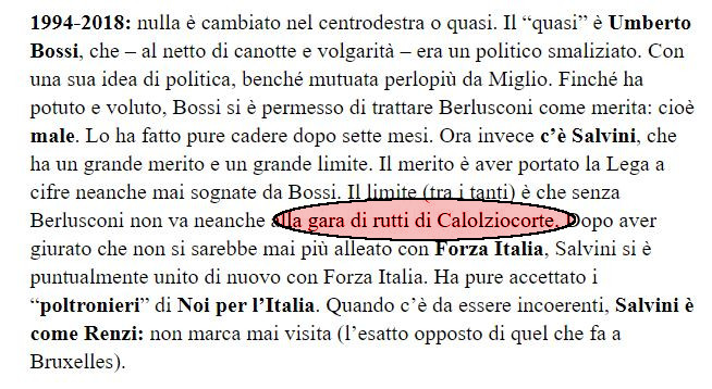 CALOLZIOCORTE – Al popolo social di Calolzio non è passato inosservato l’articolo intitolato “Jurassic Silvio, vince perché la destra non cambia” apparso su Il Fatto Quotidiano del 17 gennaio a firma del giornalista Andrea Scanzi. In un passaggio, mentre descrive la situazione del Centrodestra, il noto giornalista afferma che uno dei limiti del leader della Lega Matteo Salvini è che “senza Berlusconi non va neanche alla gara di rutti di Calolziocorte“.