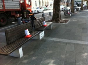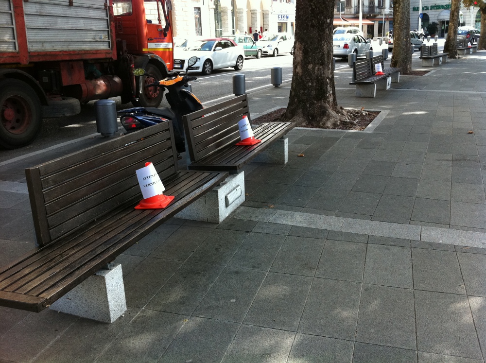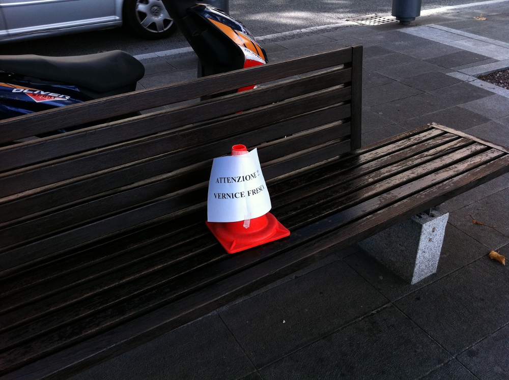 inevvertitamente rialzandosi col culo a strisce (perdonate il ‘francesismo’) su tutte le panchine sono stati prontamente collocati dei piccoli coni in plastica sui quali è stato appicciato l’avviso: “Attenzione Vernice Fresca”. Insomma, uomo avvisato… non verniciato.