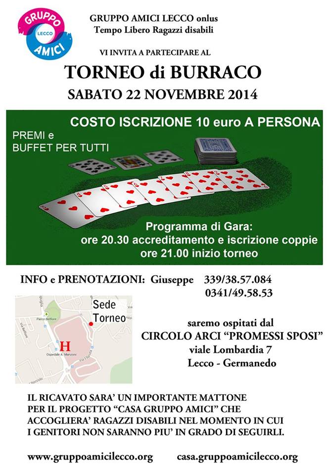 LECCO – Il “gruppo amici lecco” comunica che sabato 22 novembre si terrà un torneo di burraco di beneficenza. Il torneo avrà luogo a Germanedo presso il circolo ARCI “promessi sposi” in viale Lombardia 7( dietro l’ospedale A.Manzoni) dalle ore 20.30 .