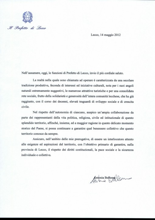 LECCO – Il nuovo Prefetto di Lecco Antonia Bellomo si è insediato lunedì andando a sostituire Marco Valentini che nel frattempo è stato spostato a Grosseto. La dottoressa Bellomo ha voluto salutare la città attraverso una missiva che vi proproniamo di seguito integralmente, nella quale auspica una fattiva collaborazione con “tutti i rappresentanti della vita politica, religiosa, civile e istituzionale di questo splendido territorio… affinchè insieme si possa continuare a garantire quel benessere collettivo che questo territorio conosce da sempre“.