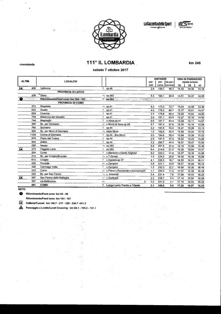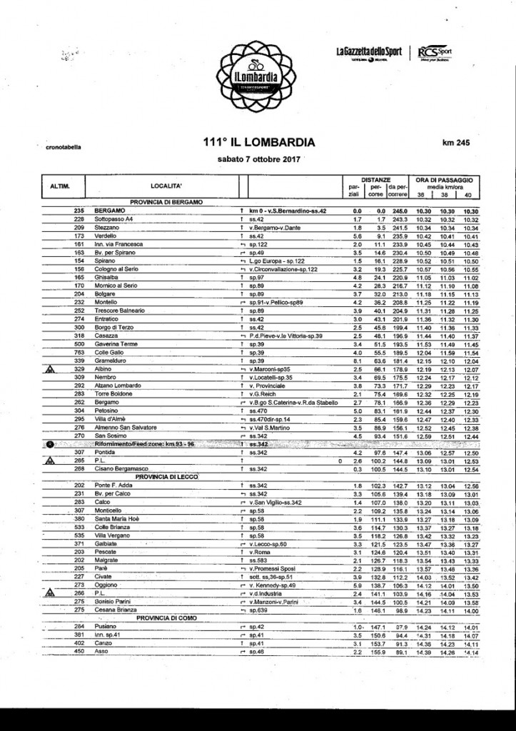 La classica delle “foglie morte”, così’ come è definito il giro di Lombardia, giunto alla sua 111esima edizione, partirà alle 10.30 da Bergamo e nel suo passaggio verso Como, dove è previsto l’arrivo, snoderà parte dei suoi 147 chilometri anche nella Brianza e dell’hinterland di Lecco, toccando (con passaggio previsto nella fascia oraria tra le 13 e le 14 di sabato) nell’ordine i comuni di Calco, Monticello, Santa Maria Hoè, Colle Brianza, Villa Vergano, Galbiate, Pescate, Malgrate, Civate, Oggiono, Bosisio Parini, Cesana Brianza e Onno.