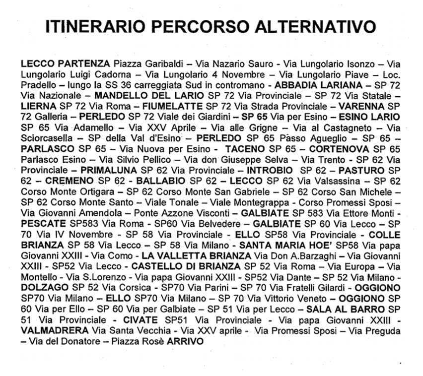 I consiglio diramato dalle istituzioni locali ai residenti di Lecco, dei Comuni interessati dal passaggio della competizione e a tutti coloro i quali da Milano, Monza o dalla Brianza intendano raggiungere Lecco o la Valsassina nella giornata di domenica 8 ottobre di evitare spostamenti nella fascia oraria compresa tra le 9 e le 11.
