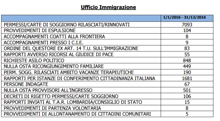 L’Ufficio Immigrazione si è particolarmente impegnato nella gestione dei profughi provenienti dal nord africa, per lo più di nazionalità della Costa d’Avorio, Senegal, Etiopia, Siria, Nigeria, Mali, Pakistan e Gambia, che sono collocati in varie strutture di accoglienza presenti in Provincia.