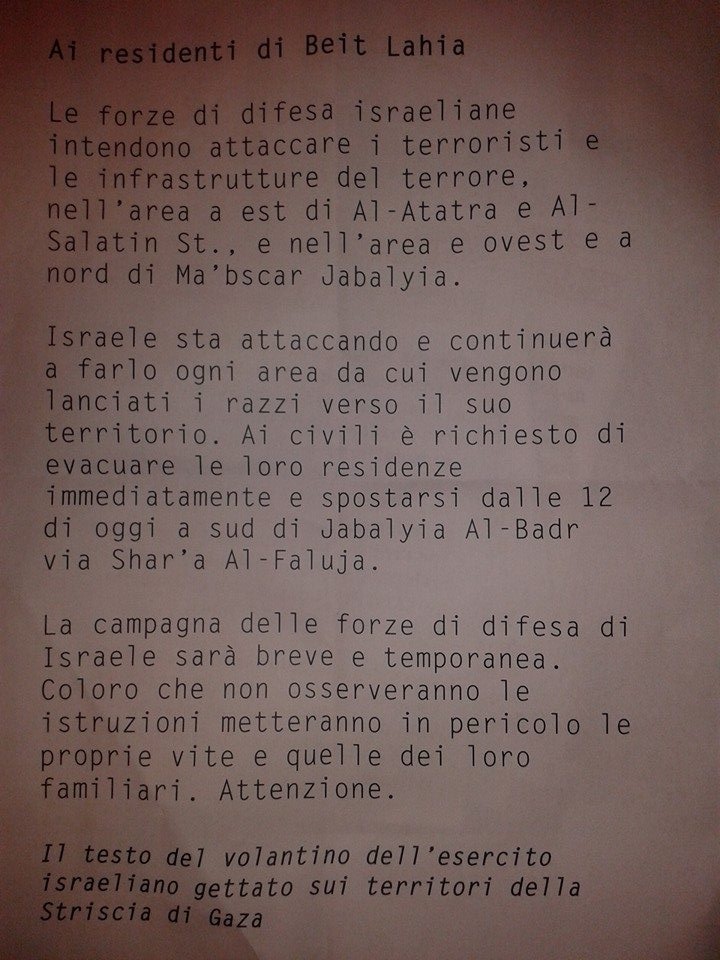 Molti i documenti letti durante il presidio, tra i quali il testo del volantino dell’esercito israeliano gettato sui territori della striscia di Gaza.